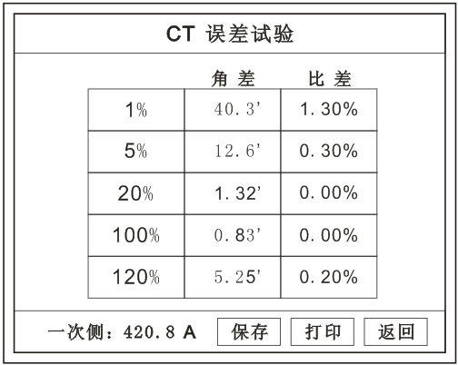 按額定一次的:1%、5%、20%、100%、120%取值,同時顯示出角差與比差。